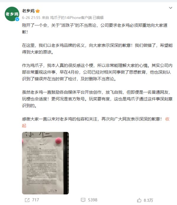 导读:6月26日,老乡鸡为调侃蔡徐坤孩子小名“活珠子”的言论发文道歉。有媒体评论:老乡鸡应该负起的是自己的社会责任。老乡鸡,这一次,“鸡”你不太美。