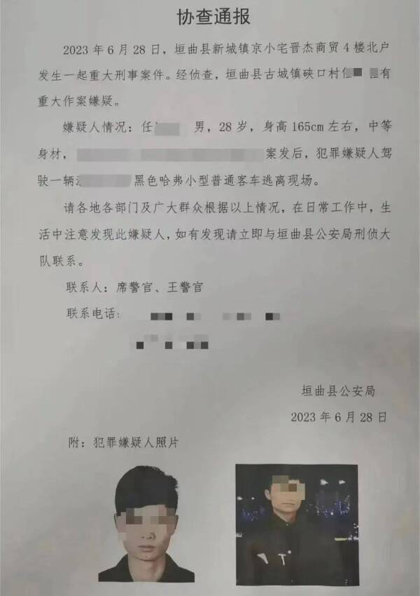警方协查通报显示,28日,垣曲县新城镇京小宅晋杰商贸4楼北户发生一起重大刑事案件。经侦查,垣曲县古城镇硖【xiá】口村任某某有重大作案嫌疑。