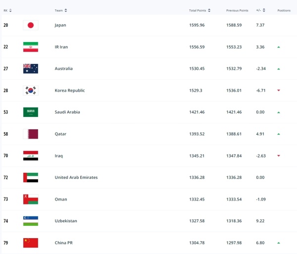 亚洲前10名分别是日本(20)、伊朗(22)、澳大利亚(27)、韩国(28)、沙特(53)、卡塔尔(58)、伊拉克(70)、阿联酋(72)、阿曼(73)、乌兹别克斯坦(74)。