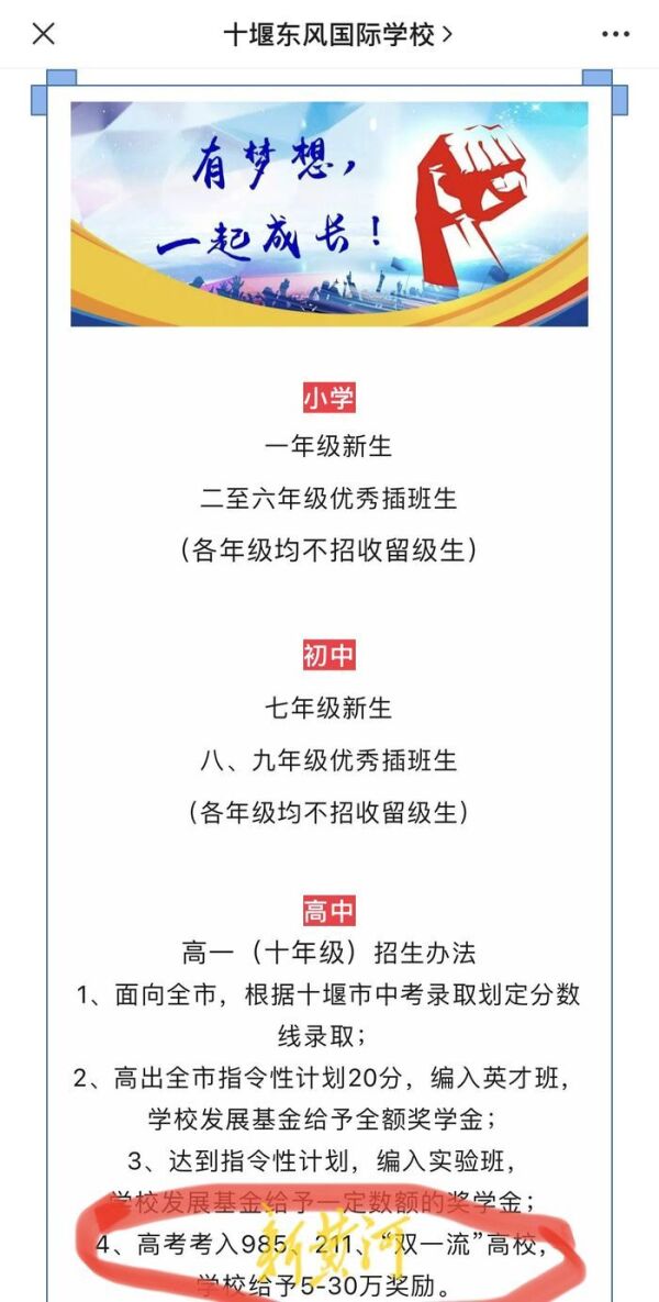 目前十堰东风国际学校的微信公号上仍保留着一篇题为《重磅消息!十堰东风国际(集团)学校学位预订开始了!》的文章,文章里明确写着:高考考入985、211“双一流”高校的,学校给予5-30万奖励。这篇文章刊发时间为2019年4月9日。