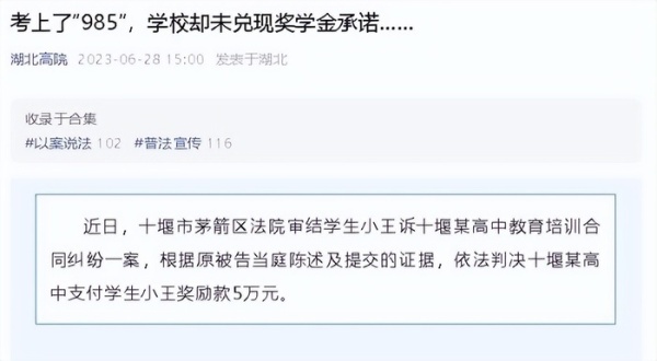 6月28日,湖北省高院微信公号公布了一则案例:招生简章上写着,高考考入985、211“双一流”高校的,学校给予5-30万元奖励。2022年6月,小王(化名)考上一所985大学,学校却没有兑现奖励,故提起诉讼。湖北十堰市茅箭区法院判决,学校支付学生小王奖励款5万元。