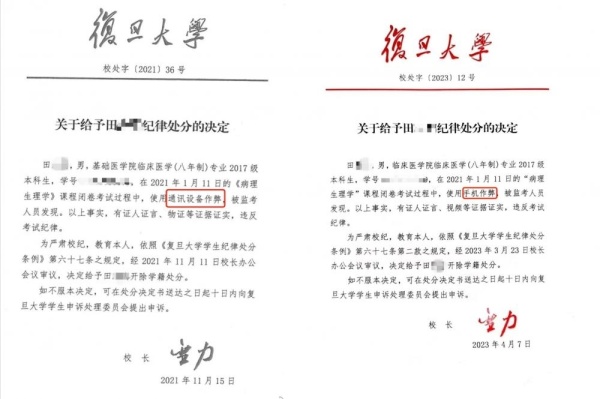 ▲复旦大学先后两次作出了开除决定。 图片来源/受访者供图