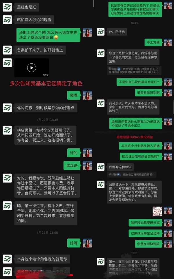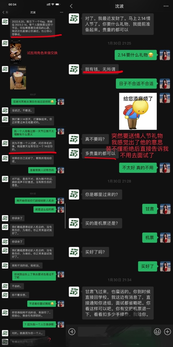 聊天记录的大致内容就是选角导演用角色和女生做交换,通过送情人节礼物的方式诱骗女生,在女生明确拒绝后,直接告诉女生不用参加面试了,多次告知女生基本已经确定了角色,想在签合同之前见一下女生,女生想曝光聊天记录被少女神探工作人员威胁,称以后对她没有好处。
