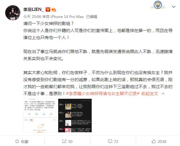 李恩在后续的微博中透露,有多位女生被选角导演沈导骚扰,在《少女神探》剧组发出声明后,李恩随后也发文反击了《少女神探》剧组,李恩质疑剧组称沈导是外聘人员,因为在宣传图上,沈导的名字是在第一,而且导演的位上也只有他一个人,紧接着李恩又表示不知道为什么剧组没有换女主角,如果此剧不换女主角上映的话,她会很无语,其实爆料了那么多,李恩的用意很明显了,就是要让剧组把都美竹的女主角换掉。