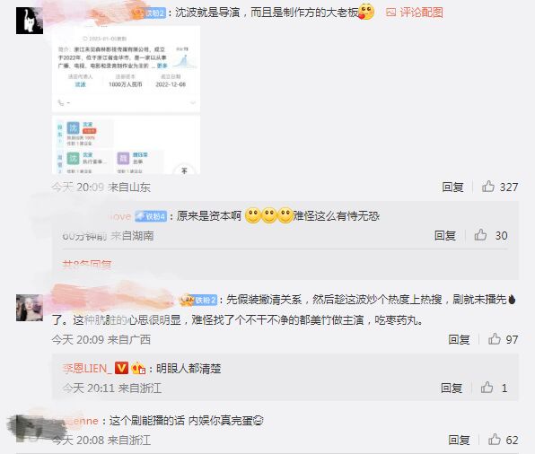 有网友在评论区也质疑剧组的声明,称沈导就是导演,而且还是制作方的大老板,并晒出了相关公司的企业资料,还有网友表示这个剧就是想炒热度上热搜,才找了都美竹做主演,剧要是能播,内娱就真的完了,李恩则回复称:“明眼人都清楚”。