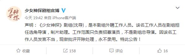 《少女神探》剧组官博发声明表示,爆料中的沈导是剧组外聘人员,在剧组担任选角导演和制片助理,工作范围只负责招募演员,不是剧组总导演,因该名工作人员发言不当,剧组对他做出批评并开除处理,而且永不会在录用。