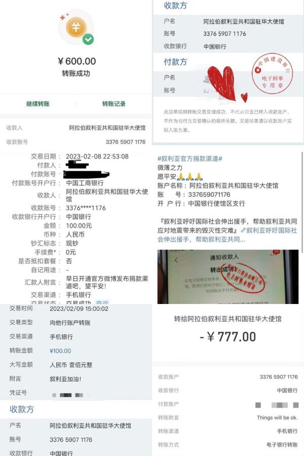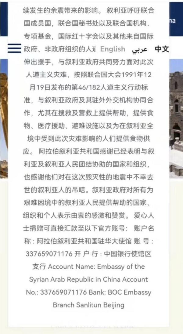 导读:日前,叙利亚驻华大使馆已开放官方捐款通道。叙利亚驻华大使馆表示,截至2月8日,已经收到了数千笔来自中国的爱心捐款。