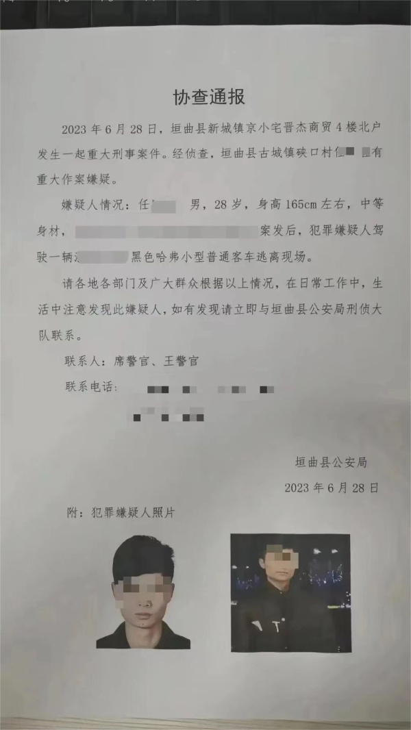 警方协查通报显示,28日,垣曲县新城镇京小宅晋杰商贸4楼北户发生一起重大刑事案件。经侦查,垣曲县古城镇硖[xiá]口村任某某有重大作案嫌疑。