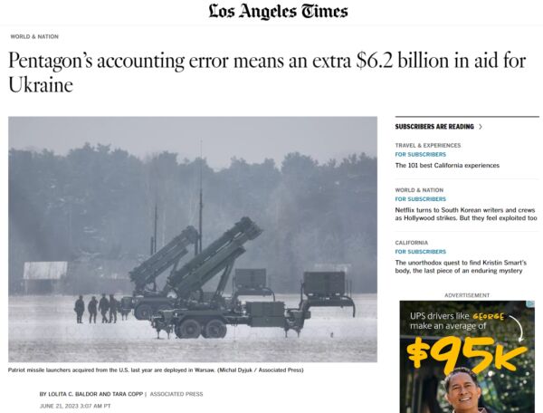 对配图中的英文标题进行检索,结果显示,该标题源自美国《洛杉矶时报》(Los Angeles Times)于2023年6月21日发布的一篇新闻报道,标题中文译文为:五角大楼的“会计差错”意味着有额外62亿美元可向乌克兰提供援助。