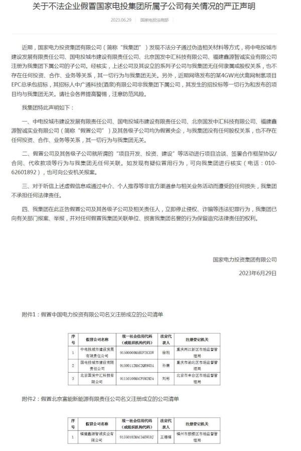 报道刊发3个小时后,国家电投发布声明:“近期网络发布的某4GW光伏离网制氢项目EPC总承包招标,其招标人中广通科技(酒泉)有限公司非我集团下属公司,其发生的招投标等一切行为和发布的项目均与我集团无关。”官方公告证实了每经的报道。