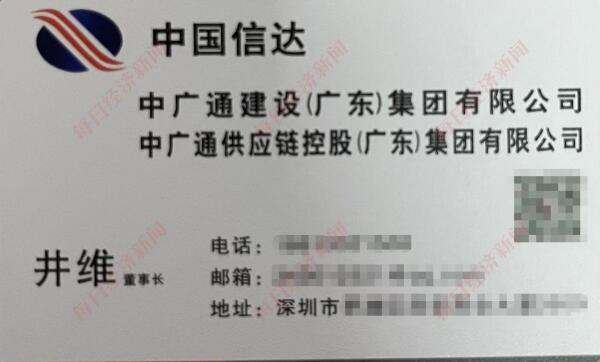 值得一提的是,这张名片上印着“中广通建设(广东)集团有限公司”“中广通供应链控股(广东)集团有限公司”,董事长为井维,后面这家公司正是此前国资委“中央企业公告的假冒国企名单汇总(第二批)”中的企业之一。