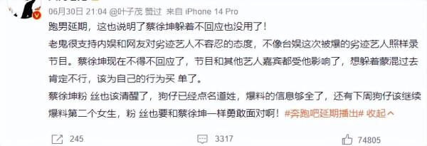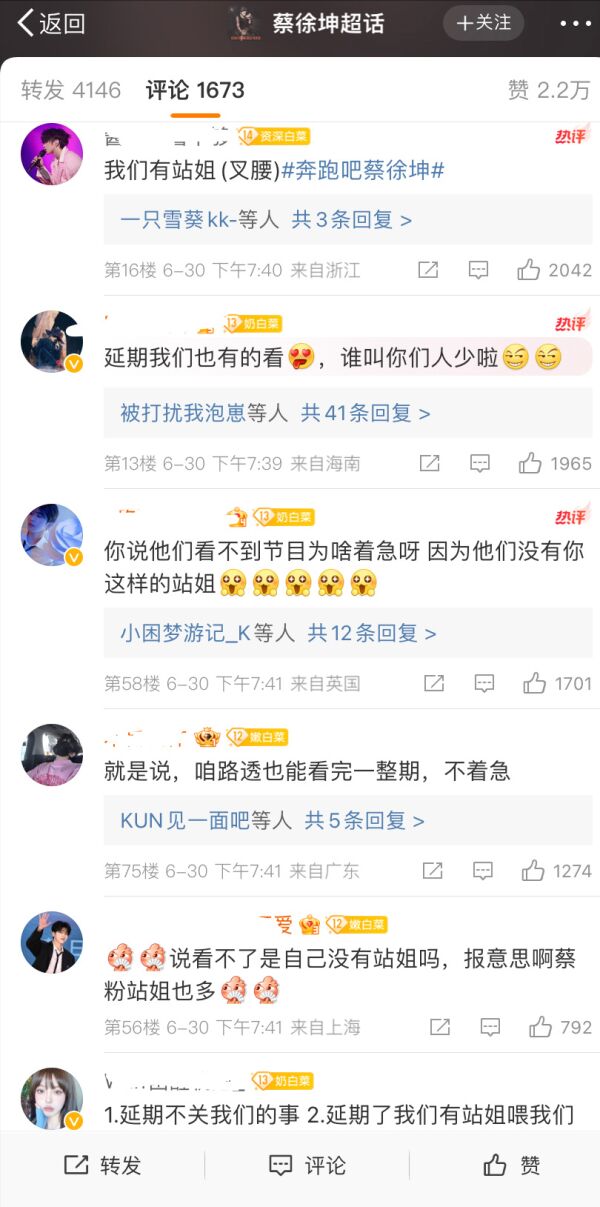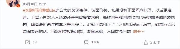 虽然与蔡徐坤合作的品牌方与节目组,在事件发生当天没有任何取消合作的动作,但直到6月30日晚,本该播出最新一期《奔跑吧》节目组,却率先做出了举动,延播了节目。