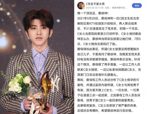 蔡徐坤疑似一夜情致女方怀孕打胎的事件,发酵了近一周,一直没有等来蔡徐坤方的回应。
