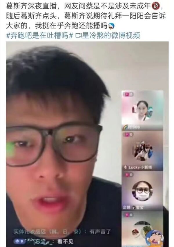 6月30日晚,台湾狗仔葛斯齐深夜直播,还与网友连线。有网友提问蔡徐坤的事情,会不会涉及未成年人。