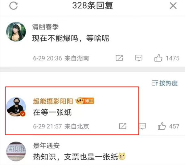 随后,又有网友发现,内地狗仔阳阳早在29日的时候,就在评论区评论过,称在等一张纸。