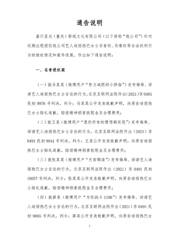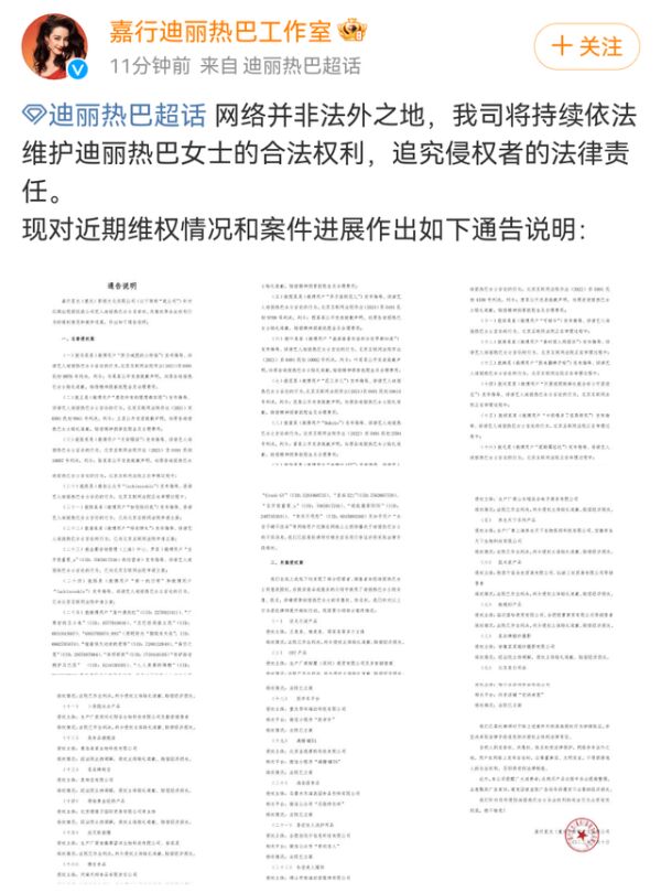 迪丽热巴工作室发布严正声明,认为网络并非法外之地,工作室将持续依法维护迪丽热巴女士的合法权利,追究侵权者的法律责任。工作室详细对近期维权情况和案件进展进行通报,把网络上有造谣行为的个人ID用户全部公布,还是很有震慑作用的。