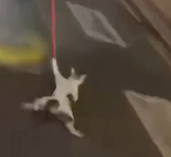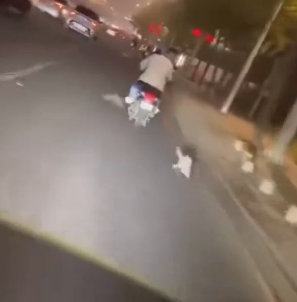视频内容显示,该男子将绳子的一端系在小猫的一条前腿上,将绳子的另一端系在电动车的后座上,随后该男子在前方骑行,小猫用剩下的三条腿在后方卖力的追赶,但奈何体力有限,最终只得被拖行一路。
