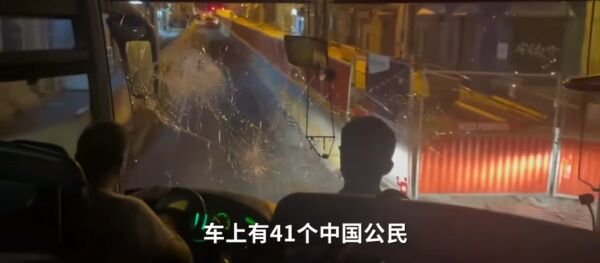 王先生回忆当时的情形时表示,“因为当时我就坐在大巴车的最前方,很清楚地看到有五六个蒙面的暴徒,拿着大石头开始砸我们的车。之后,司机还往前开了一段路,但前方的暴徒越来越多,他们甚至还用街边的一些围栏摆在路中间,试图拦住我们的车。”