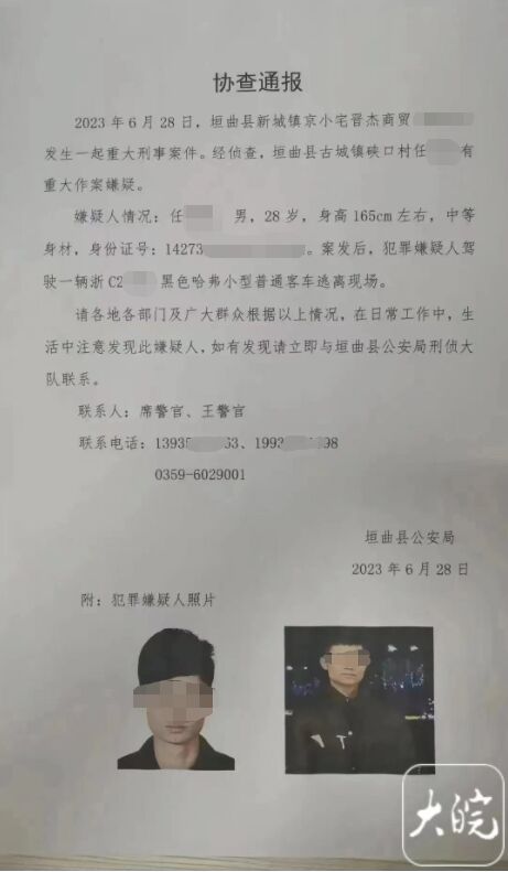 3天前,一起“男子杀害妻儿、砍伤岳母”的案件打破了山西运城垣曲县百姓的宁静。据网传的一份垣曲县公安局发布的协查通报称,6月28日,垣曲县新城镇京小宅晋杰商贸4楼北户发生一起重大刑事案件。经侦查,垣曲县古城镇某村任某某有重大作案嫌疑。