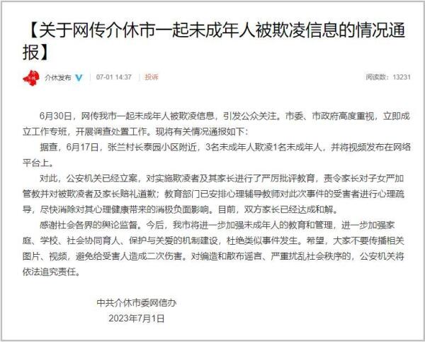 据@介休发布 消息,山西省晋中市介休市委网信办7月1日通报称,6月30日,网传介休市一起未成年人被欺凌信息,引发公众关注。介休市委、市政府高度重视,立即成立工作专班,开展调查处置工作。据查,6月17日,张兰村长泰园小区附近,3名未成年人欺凌1名未成年人,并将视频发布在网络平台上。