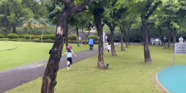 戴着安全帽的霍中妍也跑了起来,她用英文大叫“Daddy,riding my bike,give me back……daddy”(爸爸,骑了我的车,还给我,爸爸)。