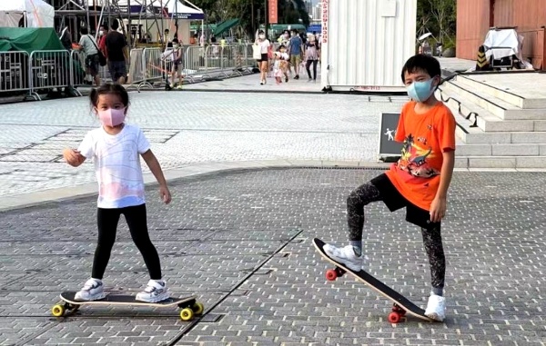 哥哥姐姐踩单车,小妹妹玩滑板: