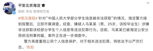 据@平安北京海淀 微博通报,针对“中国人民大学部分学生信息被非法获取”的情况,海淀警方接到报警后,立即开展调查。经查,嫌疑人马某某(男,25岁,该校毕业生)涉嫌非法获取该校部分学生个人信息等违法犯罪行为。目前,马某某已被海淀公安分局依法刑事拘留,案件正在进一步调查中。