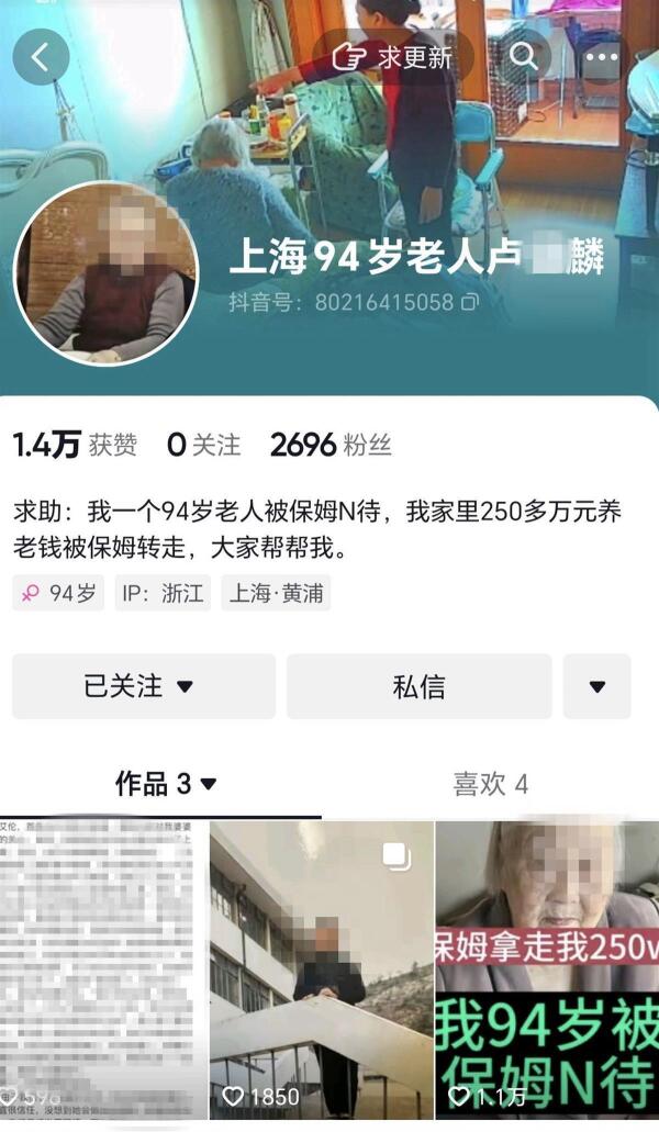 6月29日,一个名为“上海94岁老人卢某麟”的社交账号发布了一段视频,视频中卢阿婆向网友求助,称她和失明的老伴惨遭保姆蒋某珍虐待,还被其分多次转走250万元养老钱。