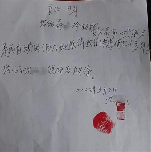 对此,沈先生的儿媳沈女士表示,签订这个证明是在他们知情之后,保姆为逃避责任,逼着她公公写的。一开始她和丈夫也在场,结果他们刚离开一会,蒋某珍就给公公洗脑,说两位老人没有她不行,除了找她找不到其他更好的保姆了。当时,蒋某珍还让她和丈夫也签字,但他们没有签。“当天蒋某珍情绪很激动,公公状态也很不好,我们也不想他受刺激,就没有极力阻拦。”