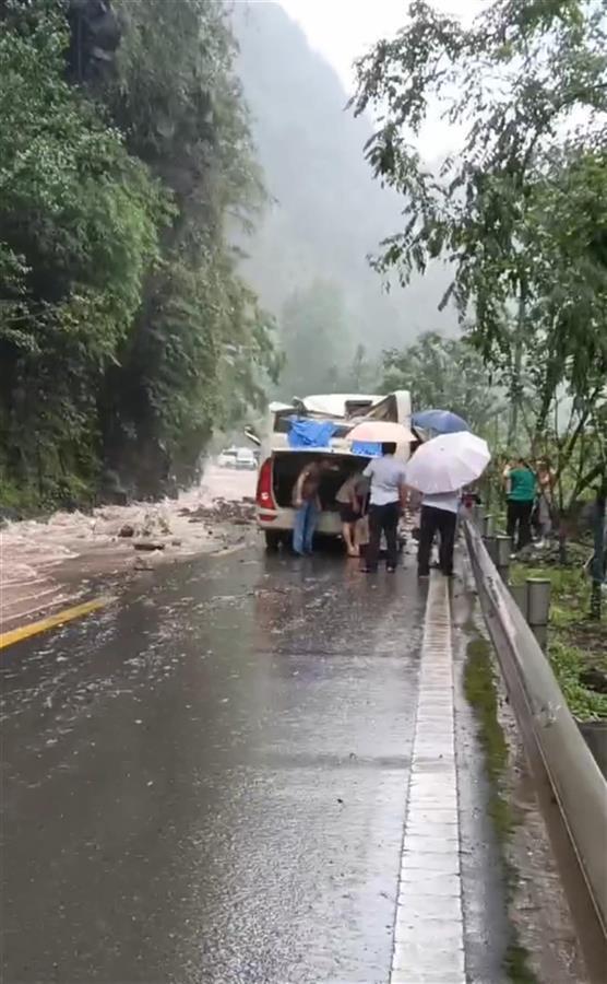这辆中巴车离开公平镇镇区,往西行驶了大约3公里远,意外发生了。车辆左侧30米高的山上,几块大石头滚落下来,砸中了中巴车……