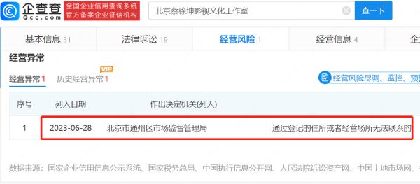 其中,北京蔡徐坤影视文化工作室因通过登记的住所或者经营场所无法联系,被北京市通州区市场监督管理局列入经营异常名录。