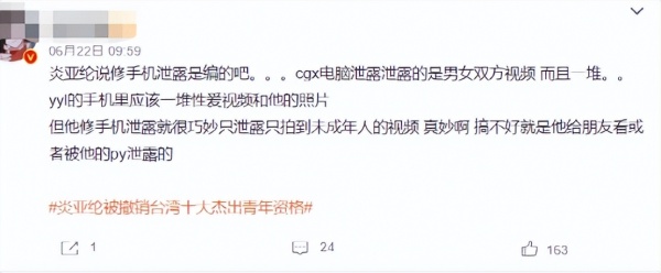 此外,邱耀乐指控炎亚纶时表示其涉嫌偷拍自己的视频,而警方提到炎亚纶涉及偷拍视频采用的“拍摄”一词,指向性不是很明确,有网友疑问究竟是拍摄还是偷拍,因为偷拍的严重程度还要比普通的拍摄严重很多,而且视频疑似也不是意外泄露的,更可能是被炎亚纶主动泄露的。