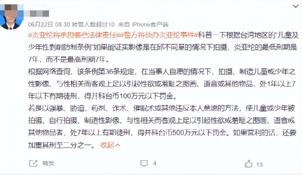 而针对相关处罚,此前就有法律专家表示,将被判处七年以上刑期,最重判15年;另外,炎亚纶还涉及触犯《刑法》窃录罪、恐吓罪,这2罪依法加重其刑1/2。如果最终指控属实,更可能遭到顶格处罚,目前就看台湾警方取证是否给力了。
