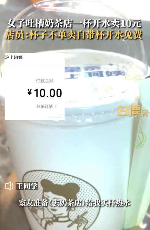 导读:7月2日,山东威海。女子吐槽沪上阿姨一杯白开水卖10元。对此,商家回应:杯子不单卖,卖的话必须收杯奶茶钱,自带杯开水免费,在收款之前已经向顾客提前告知。