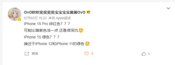 该媒体报道,“青绿色”iPhone 15 和 iPhone 15 Plus 这条消息来自于微博用户,并未附上相关链接。