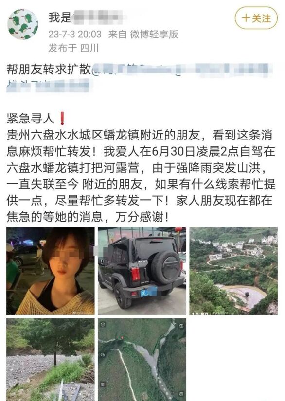 近日,网传一名女子6月30日凌晨2点自驾在贵州六盘水蟠龙镇打把河露营,由于强降雨突发山洪,一直失联至今。7月4日,六盘水水城区宣传部回复潇湘晨报记者称该情况属实,目前公安及消防还在全力搜救中。