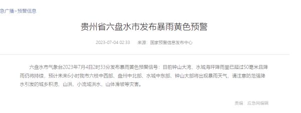 贵州省六盘水市气象台2023年7月4日2时33分发布暴雨黄色预警信号:目前钟山大湾、水城海坪降雨量已超过50毫米且降雨仍将持续,预计未来6小时我市六枝中西部、盘州中北部、水城中东部、钟山大部将出现暴雨天气,请注意防范强降水引发的城乡积涝、山洪、小流域洪水、山体滑坡等灾害。