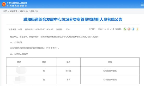 7月4日,据白鹿视频报道,近日广东广州一街道办发布了垃圾分类专管员拟聘用人员名单公告,公示人员名单上两人的学历分别为研究生和本科生。该事件引发网友关注,不少网友认为属于大材小用。