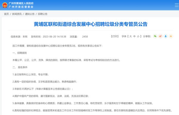九派新闻查询发现,黄埔区联合街道综合发展中心于今年6月20日发布了垃圾分类专管员的招聘公告。