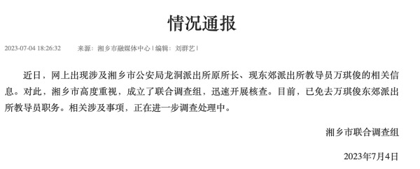 湘乡市联合调查组7月4日发布情况通报,近日,网上出现涉及湘乡市公安局龙洞派出所原所长、现东郊派出所教导员万琪俊的相关信息。对此,湘乡市高度重视,成立了联合调查组,迅速开展核查。目前,已免去万琪俊东郊派出所教导员职务。相关涉及事项,正在进一步调查处理中。