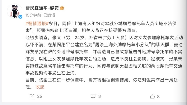今日,网传“上海有人组织对驾驶外地牌号摩托车人员实施不法侵害”,经警方核查此系造谣,相关人员正在接受警方调查。