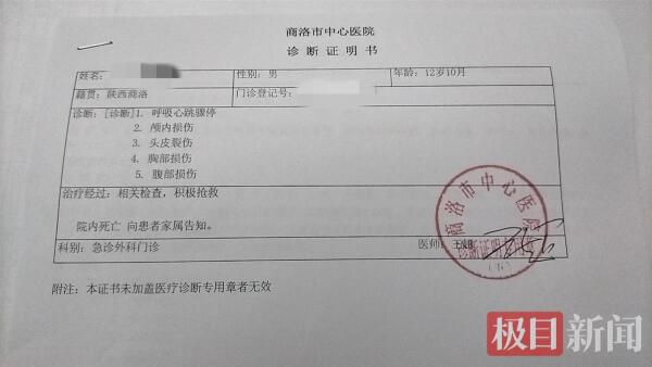 随后,小皓被送医抢救。小皓父亲郭先生提供的商洛市中心医院门诊病历显示,患者不慎被重物砸伤,伤后呼叫不应,头部出血,未呕吐。抢救数十分钟后,小皓因抢救无效死亡。