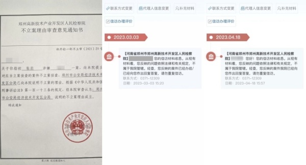 郑州市高新技术开发区人民检察院出具的《不立案理由审查意见建议书》及回复