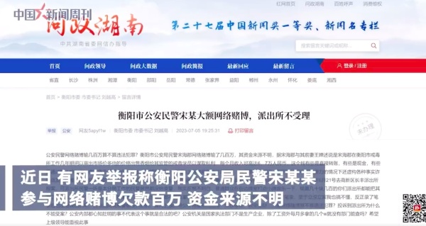 7月7日,据中国新闻周刊报道, 近日,有网友在《问政湖南》向衡阳市委书记举报称,衡阳市公安局民警宋某某参与网络赌博欠债百万,资金来源不明,称宋某某在衡阳市戒毒所工作期间,高价出售香烟给戒毒学员。