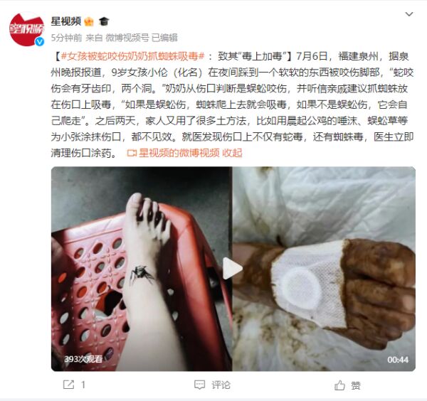 导读:7月6日,福建泉州。9岁女孩小伦被蛇咬伤,奶奶抓蜘蛛放在伤口上吸毒。小伦不仅没有好转,反而口腔出血严重。就医发现伤口上不仅有蛇毒,还有蜘蛛毒。