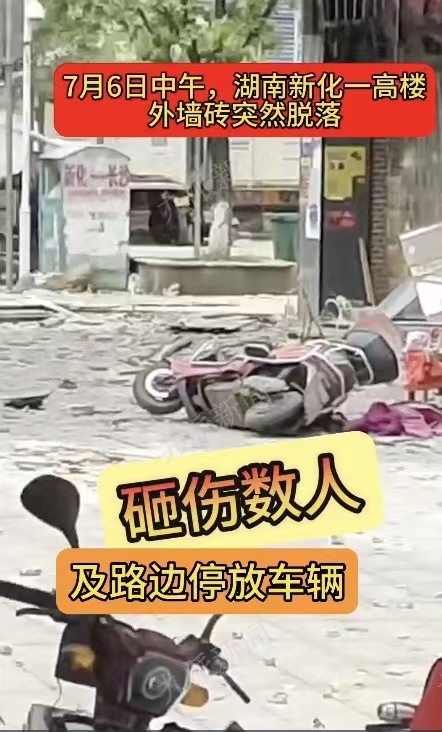 7月6日12点左右,湖南新化附近有一高楼外墙砖块掉落,砸中数人,周边停靠车辆均有不同程度受损。