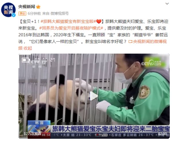旅韩大熊猫夫妇爱宝、乐宝即将迎来新宝宝。饲养员为爱宝开启昼夜陪护模式,提供最及时的护理。爱宝、乐宝2016年到达韩国,2020年生下福宝。一直照顾“宝”家族的“熊猫爷爷”姜哲远说,“它们是像家人一样的宝贝”。新宝宝叫啥名字好呢?