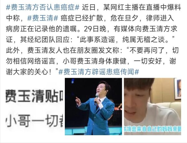 此后,除了被某网红爆料病危“处于癌症晚期”引起热议后,经纪团队辟谣之外,媒体上便很少再出现有关费玉清的报道。