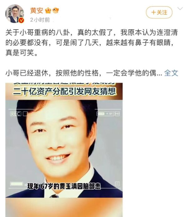 7月7日,歌手黄安愤怒发文,辟谣好友费玉清病重一事。