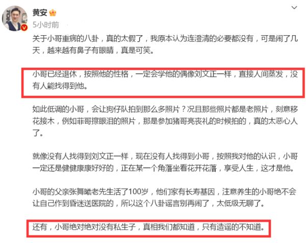 黄安在文中表示,他本不想公开回应,毕竟网上关于费玉清病重的八卦,真的很假,可谣言愈演愈烈,看上去颇为可笑。